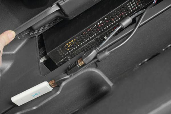 Системный блок размещен под ящиком для перчаток, к нему подключается вся периферия: дисплей, антенна GPS, модемы, есть беспроводные мышь и клавиатура. Флешка и веб-камера имеют дополнительные USB-разъёмы.