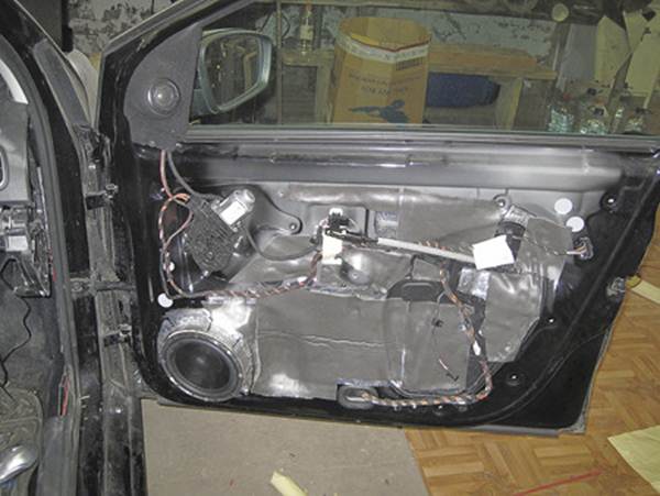 Автоакустика была решена достаточно типично для автомобилей этого класса: мидбас обжился в доработанных штатных местах, пищалки — в треугольниках зеркал. Дверь идеально вибродемпфирована, кольца-проставки из фанеры наглухо закрепляются болтами М, все стыки загерметизированы. Контур колец снаружи оклеен тканью на эпоксидке — благодаря этому исключен риск растрескивания тонкостенных деталей при обрабатывании отверстий.